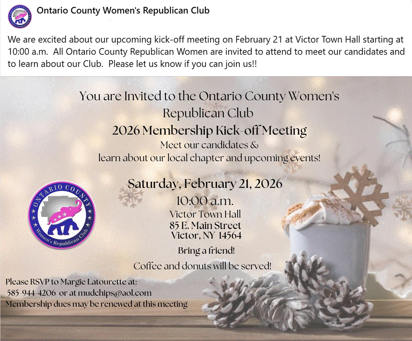 The Ontario County Women's Republican Club annual meeting commenced with a renewed spirit of patriotism and unity as members gathered to mark the beginning of a new year. The meeting served as a platform to reaffirm our dedication to the principles of the Republican Party and to strengthen bonds within our community of like-minded individuals.